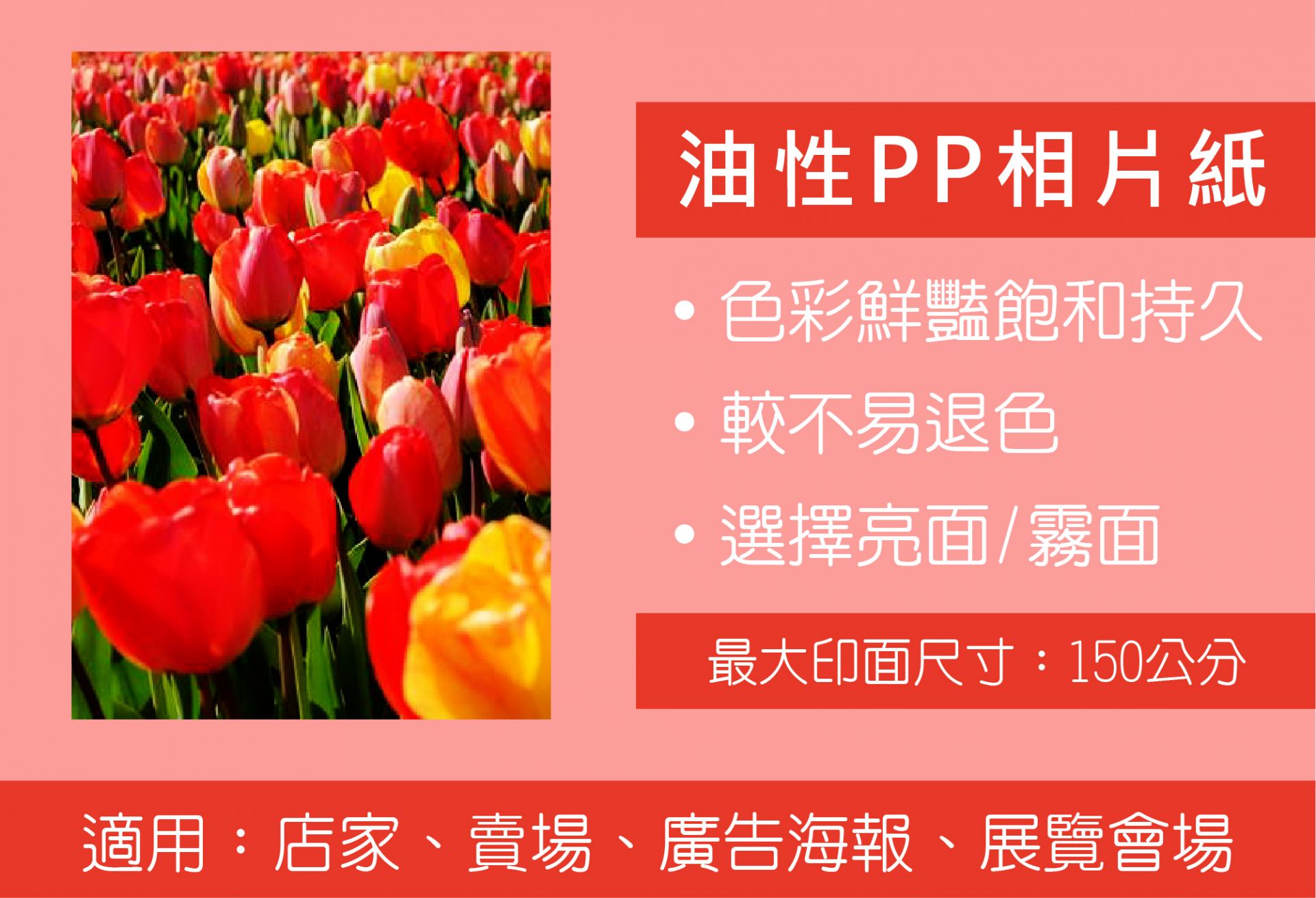 - 9. 大圖輸出與塑膠PP材質等商品,因不同材質的顯色效果不同,因此印刷成品顏色與一般紙張印刷成品不同,色差+-15%為正常範圍,舊稿加印亦難避免。若自行將一張圖分割多塊印刷顏色會有誤差是屬正常現象,因是系統調版印刷故每張圖都還是會有正負15%色差。若您對色澤很要求,或需專色特殊色印刷,建議您獨立開版製作印刷(需客服另外報價),才能滿足您的需求。